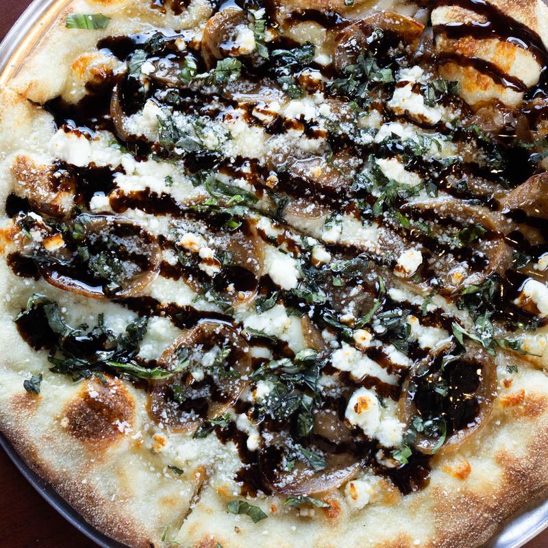 Pizza sauce base, mozzarella, grilled chicken, mushrooms, red onions, feta, and balsamic glaze.