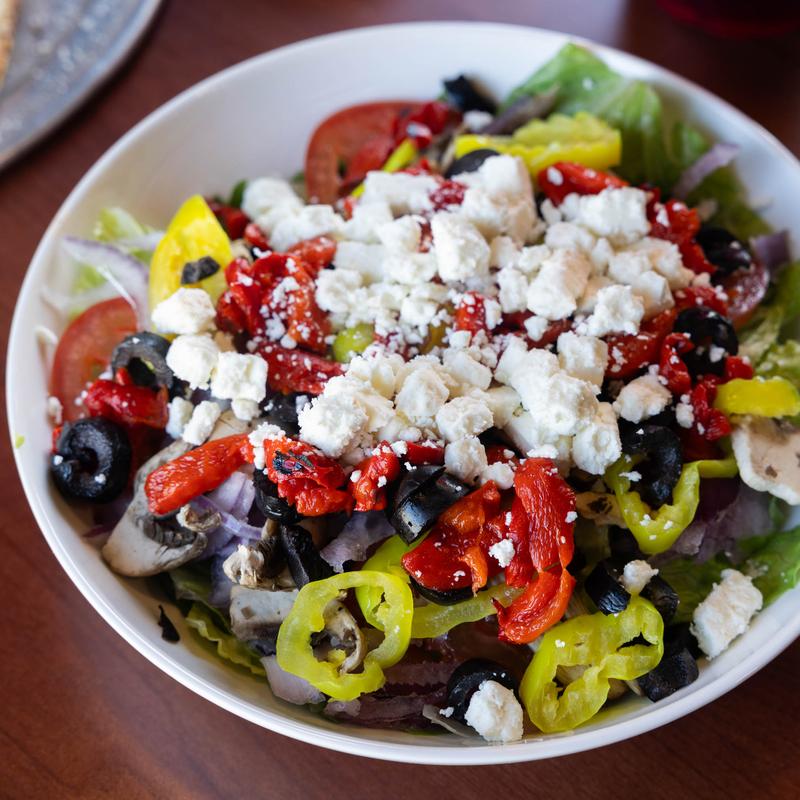 Romaine, spinach, tomatoes, cucumber, red onions, mushrooms, roasted red peppers, black olives, banana peppers, feta cheese.