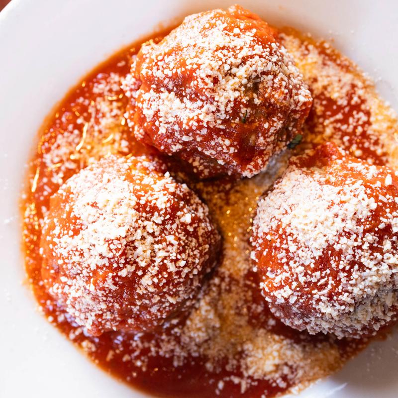 Olive oil base, mozzarella, sliced meatballs, ricotta, pizza sauce dollops. fresh basil.