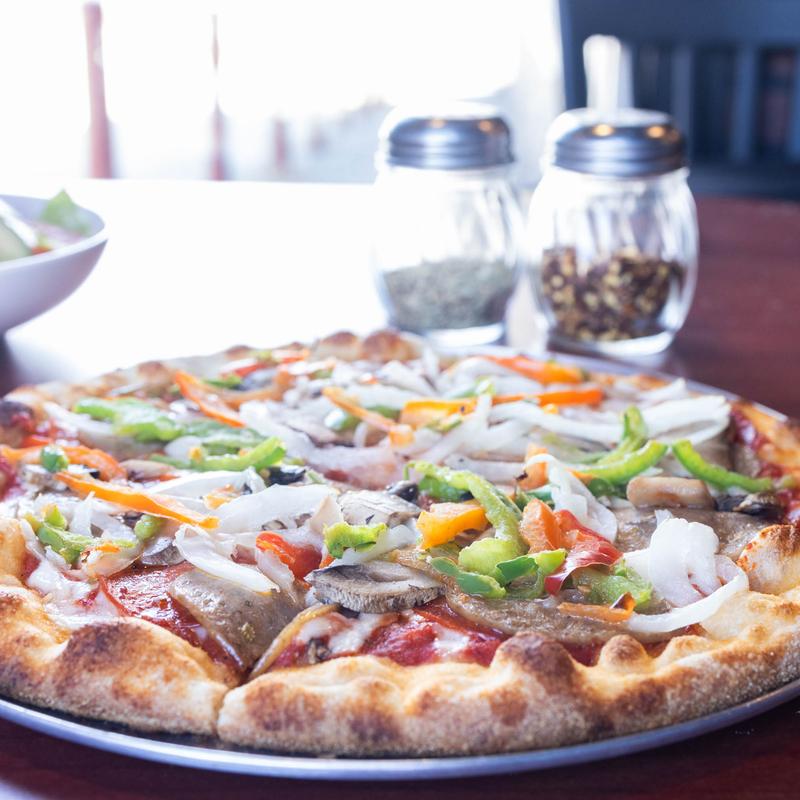 Pizza sauce base, mozzarella, spinach, mushrooms, green peppers, white onions, fresh tomatoes.