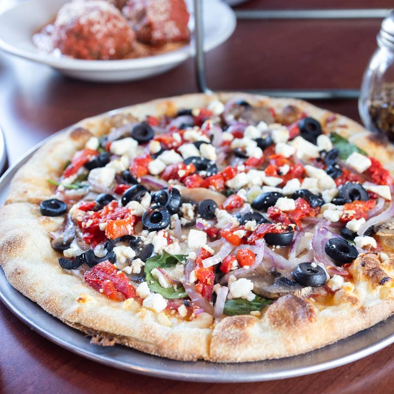 Pizza sauce base, mozzarella, spinach, mushrooms, red onions, roasted red peppers, black olives, feta.