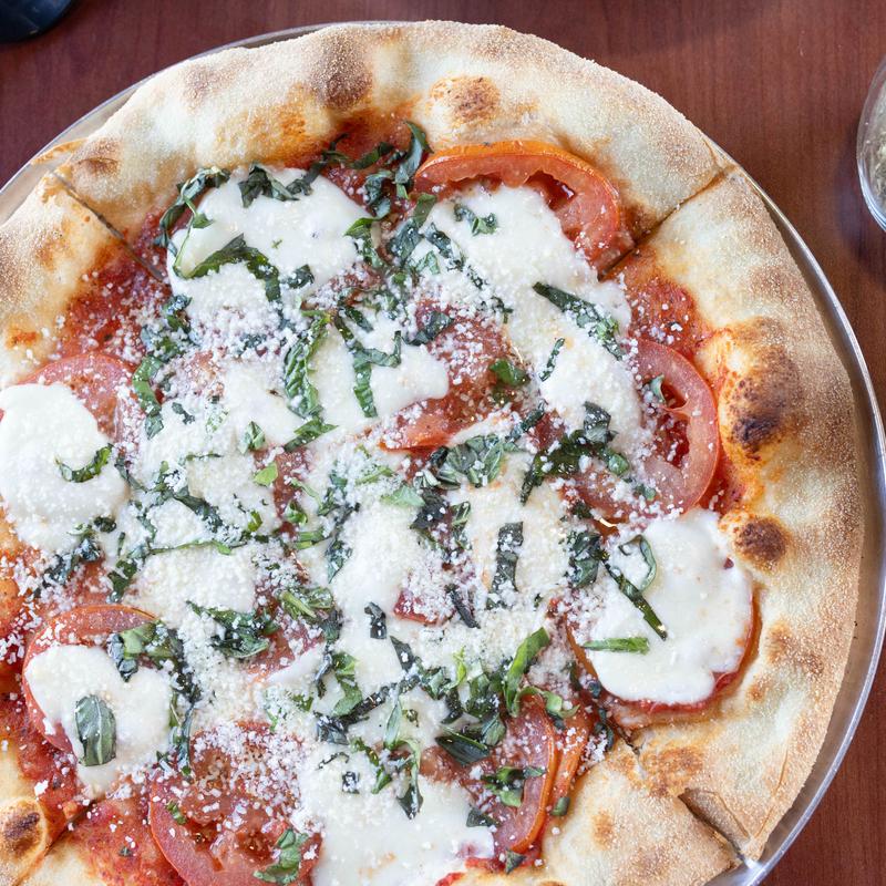 Pizza sauce base, fresh tomatoes, fresh mozzarella, fresh basil, Romano, oil swirl.