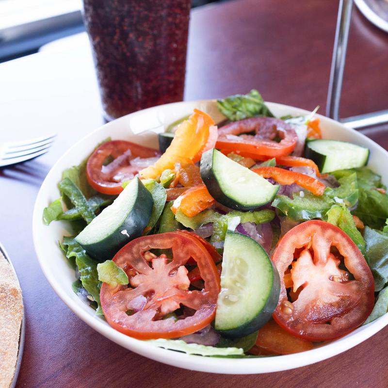 Romaine, spinach, tomatoes, cucumbers, red onions, green peppers.